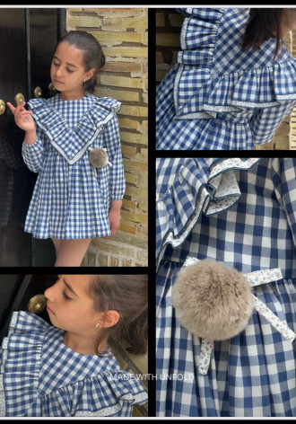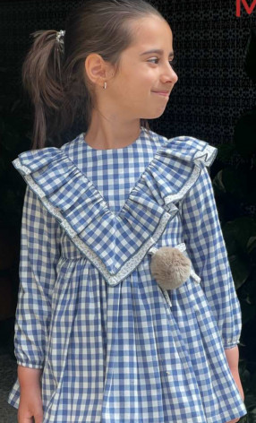 Vestido para niña, con corte en cintura y caida en color blanco y azul estampado vichy , puño terminado en gomas, cuelo con gran volante en el mismo vichy y sobre sale otro volante en florecitas del mismo tono.