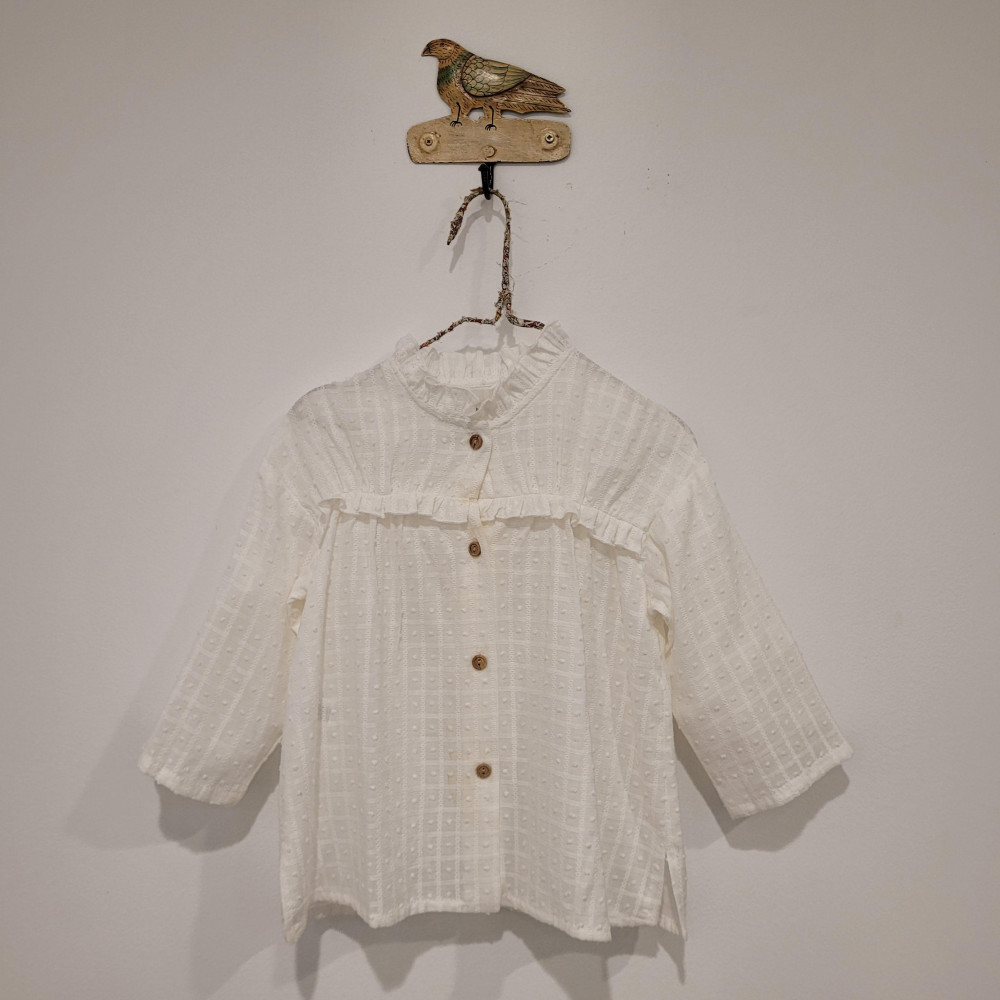 Presenta volante por todo el canesú, así como abertura completa delantera con cierre de bonitos botones de madera. Cuenta con terminación de puño recta, así como cuello volante `plisado y alzado. De la casa de moda infantil y juvenil MIA Y LIA, invierno 2025.
