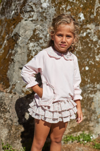 Conjunto sudadera y short ROSA Y AZUL LA MARTINICA, confeccionado algodon rosa bebe con cuelo en el estampado con florecitas , así como el short de algodon en rosa del mismo tejido. Cuenta con escote redondo y cuello grandote con el estampado de florecitas.De la COLECCIÓN ROSA Y AZUL, de la casa de moda infantil y juvenil LA MARTINICA, verano2025