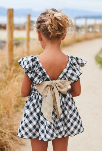 Jesusito BLACK & WHITE VICHY LA MARTINICA, confeccionado en vichy de cuadro grande blanco y negro, de talle a la cintura, así como falda de vuelo, que incluye braguita en el mismo tejido. Cuenta con escote rectangular delantero y en pico trasero, así como volantes grandes en los hombros hasta el talle ribeteados en rulo negro. En la espalda presenta bonito lazo en tejido tostado. La falda se presenta cortada al bies.De la COLECCIÓN BLACK & WHITE, de la casa de moda infantil y juvenil LA MARTINICA, verano 2025.