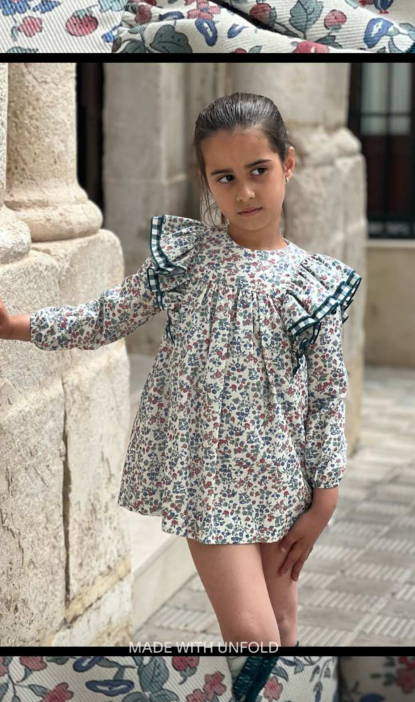 Vestido para niña, estampao de flores con fondo blanco roto detalle volante en el pecho y terminado doble volante en cuadro vichy en color verdecita. Los puños llevan goma-